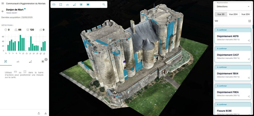 The Donjon is now digitized in 3D and archived on A2D’s collaborative SaaS platform, accessible to all stakeholders in the renovation project (architects, construction companies, design offices, technical departments of the conurbation…). This living archive enables precise monitoring of the progress of the work, with successive diagnostics over time to verify the effectiveness of the work, ensure complete traceability with before-and-after comparisons for each area treated, as well as precise, objective documentation for insurance companies and inspection bodies.