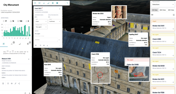 et notre solution A2D Cloud les analysera et détectera automatiquement les pathologies et défauts avec visualisation sur un jumeau numérique 3D haute précision en quelques heures (vs semaines d’expertise traditionnelle).